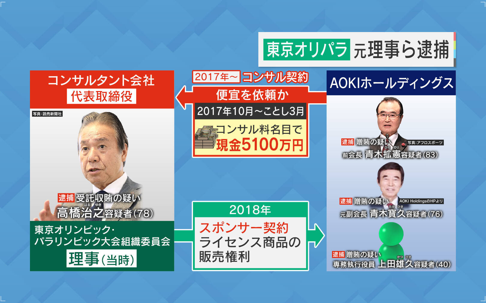 2017年、高橋容疑者が代表を務める会社が、「AOKI」とコンサルタント契約を結びました。そして2018年に、「AOKI」側は組織委員会とスポンサー契約を結び、公式ライセンス商品を販売することになります。高橋容疑者は、この大会スポンサーの契約などを巡って便宜を図るように依頼を受け、その見返りに現金5100万円を受け取った疑いが持たれています。