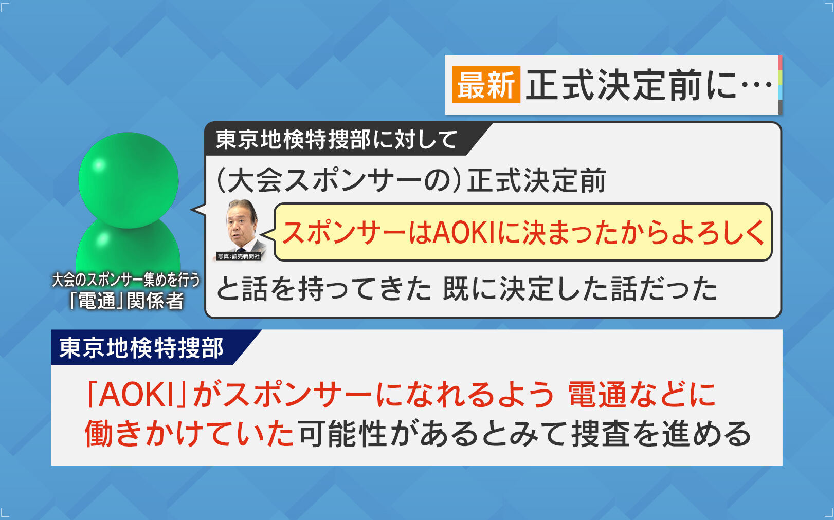 また新たに、大会のスポンサー集めをしていた電通の関係者から「スポンサーの正式決定前に、高橋容疑者から『スポンサーは「AOKI」に決まったからよろしく』と言われた。すでに決定した話だった」との証言が出ました。東京地検特捜部は「AOKI側がスポンサーになれるよう、電通に働きかけていた可能性がある」として捜査しています。