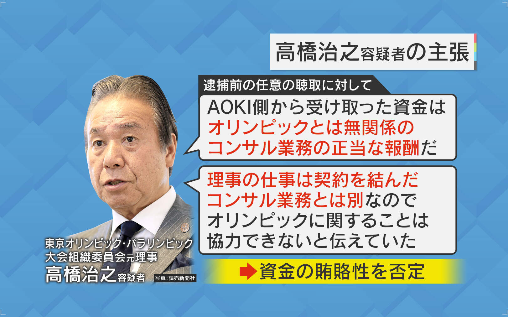 高橋容疑者は「『AOKI』から受け取った資金は、オリンピックとは無関係のコンサル業務の正当な報酬だ。理事の仕事は契約を結んだコンサル業務とは別なので、オリンピックとは無関係だ」と否定しています。