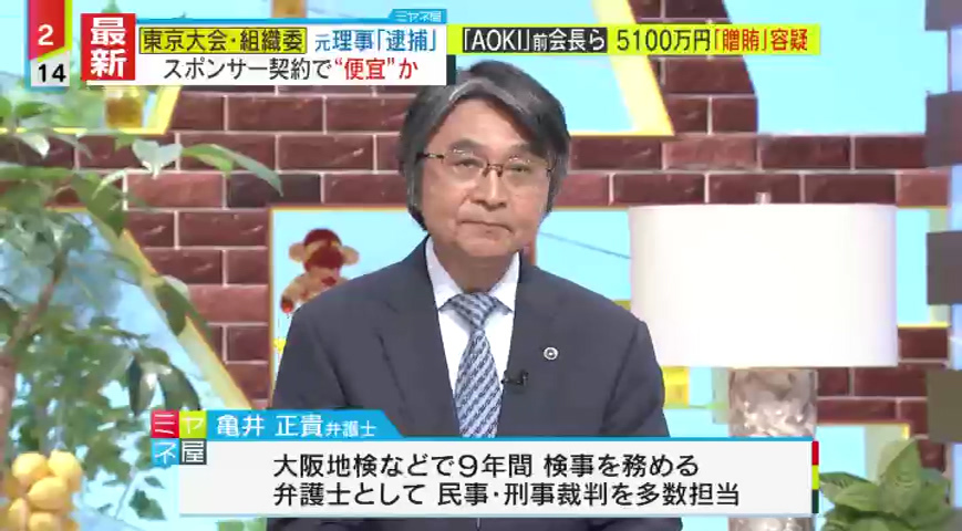 東京オリンピック・パラリンピックの大会スポンサー契約をめぐり、大会組織委員会の元理事・高橋治之容疑者が「受託収賄罪」の容疑で逮捕されました。また、大会スポンサーだった紳士服大手「AOKIホールディングス」の前社長ら3人も、賄賂を贈った疑いで逮捕されています。夢の舞台の裏で起きていた、不透明なカネの流れ…今後の捜査のポイントを、亀井正貴弁護士が解説します。