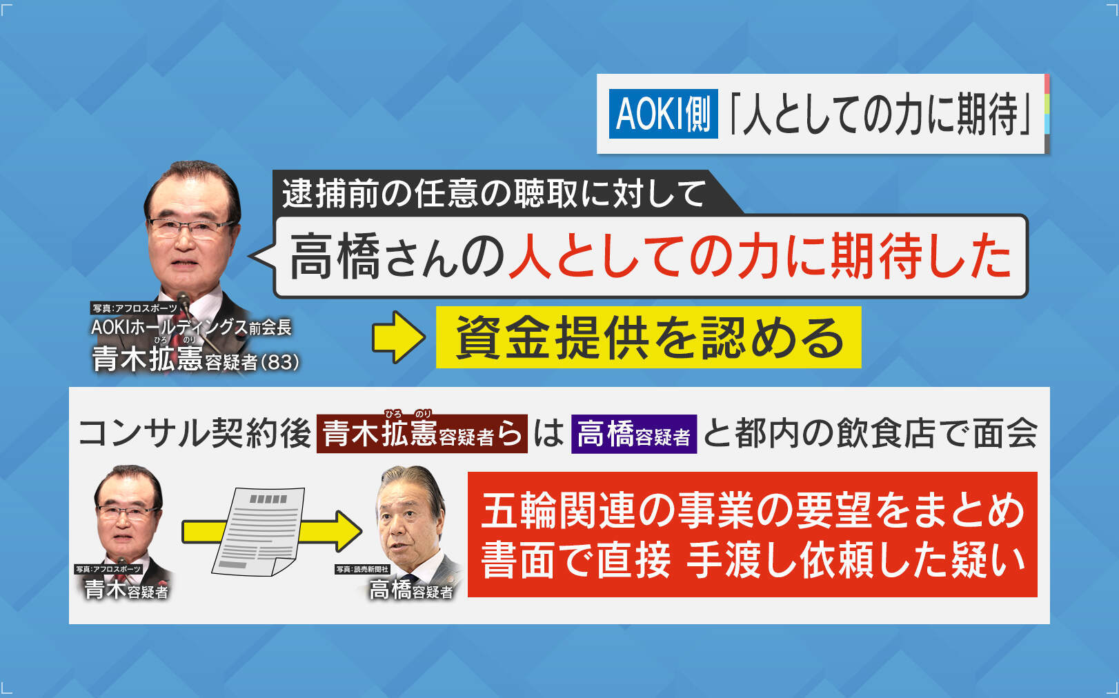 「AOKI」側の青木容疑者は「高橋氏の人としての力に期待した」と、資金提供を認めています。「AOKI」側は、コンサルタント契約をした後、都内の飲食店で高橋容疑者と面会して、オリンピック関連の要望をまとめた書面を直接手渡し依頼した疑いがあります。