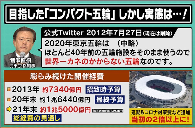 2012年の段階で猪瀬元東京都知事は、「2020年東京オリンピックは、40年前の五輪施設をそのまま使うので、『世界一カネのかからないオリンピック』なのです」と投稿していました。しかし、招致をしたときの予算はおよそ7340億円だったのに対し、結局総経費の見込みは1兆5000億円となり、当初の2倍以上となりました。