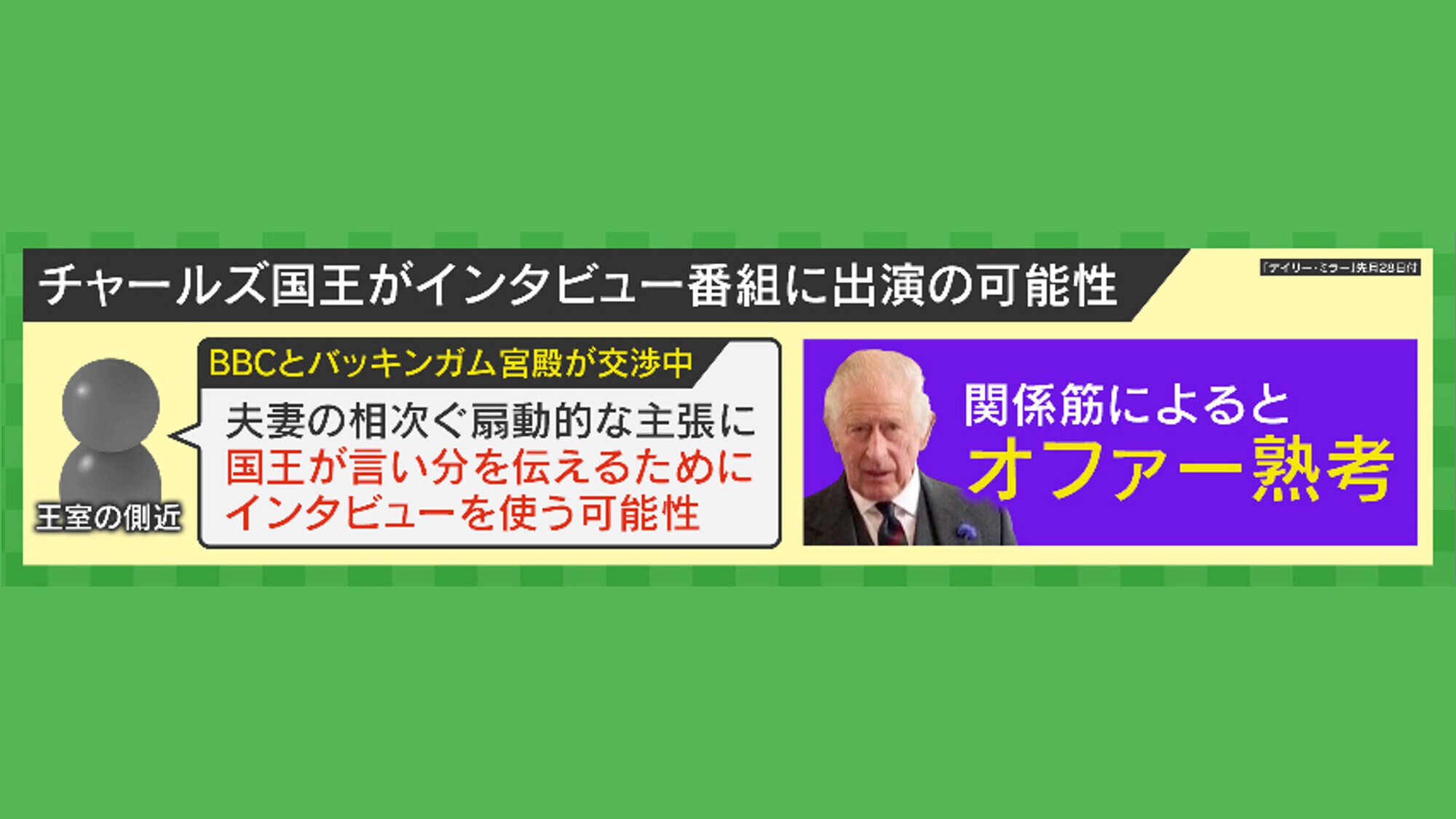 「回顧録」出版後、王室批判が集まったため、BBCとバッキンガム宮殿がチャールズ国王のインタビュー番組の出演について交渉中だということです。王室の側近は「夫妻の相次ぐ扇動的な主張に、国王が言い分を伝えるために、このインタビューを使う可能性がある」としていて、関係筋によると、チャールズ国王はオファーを熟考されているということです。