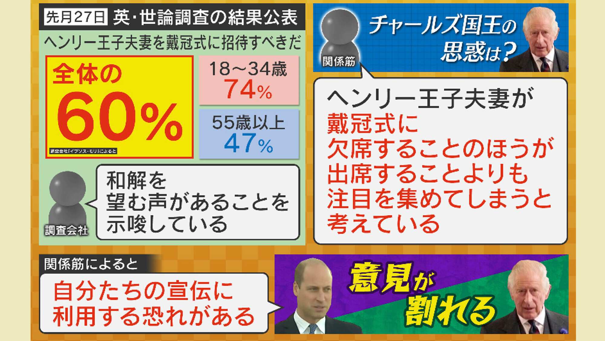 チャールズ国王が夫妻の出席を熱望するのは、世論調査が理由ではないかといわれています。1月27日にイギリスで行われた「ヘンリー王子夫妻を戴冠式に招待すべきかどうか」という世論調査には、全体の60%が「招待すべきだ」と返答しています。中でも18歳~34歳の若者は、74%が「招待すべきだ」としているということです。調査会社は「和解を望む声があることを示唆している」としています。