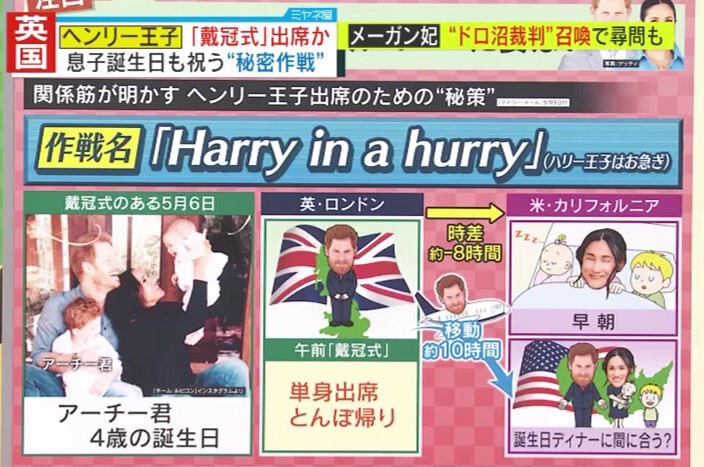 戴冠式のある5月6日は、ヘンリー王子夫妻の息子・アーチー君の誕生日です。戴冠式に出席すると、アーチー君の誕生日会はどうなるのか?という勝手な心配をした報道がありますが、関係筋によると、ヘンリー王子が両方に参加する“秘策”を提示するのではないかと明かしています。戴冠式はイギリス・ロンドンで午前中に行われます。アメリカ・カルフォルニアとの時差は8時間あるため、ヘンリー王子が単身出席してイギリスからとんぼ返りすれば、移動に約10時間かかったとしても、誕生日ディナーには間に合うのではないかというものです。