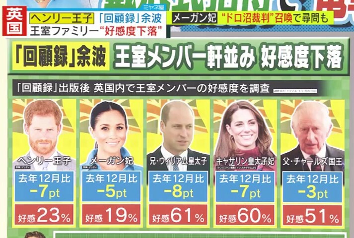 ヘンリー王子の「回顧録」発売後、イギリス国内で行った王室メンバーの好感度調査では、ヘンリー王子は「好感」が23%、メーガン妃はわずか19%と低い数字になりました。これは夫妻以外の王室メンバーにも影響していて、ウィリアム皇太子は2022年12月と比べて-8%の61%、キャサリン妃は-7%の60%、チャールズ国王は-3%の51%と、軒並み好感度が下がったということです。