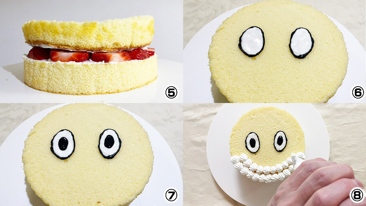 ⑦イチゴと生クリームでスポンジの上に帽子を作る
