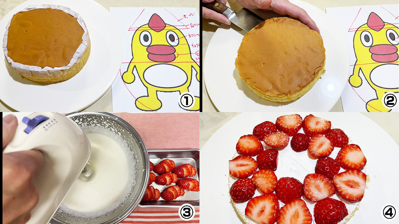 ④スライスしたスポンジ片面に泡立てた生クリームを塗りイチゴを並べ、水平に切ったもう一枚のスポンジの上にもクリームを塗り、逆さにしてのせる