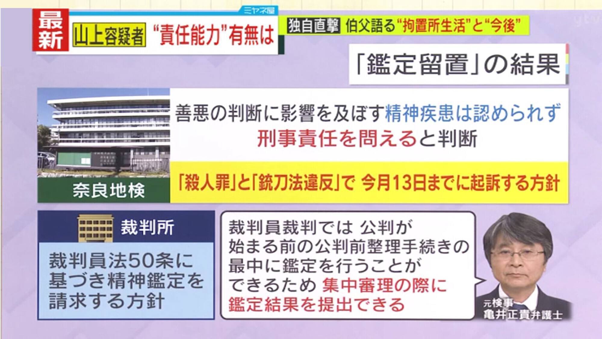 山上容疑者について、奈良地検は「善悪の判断に影響を及ぼす精神疾患は認められず、刑事責任を問える」と判断し、『殺人罪』と『銃刀法違反』で、勾留期限を迎える1月13日までに起訴する方針です。また裁判所は、「裁判員法50条に基づき、精神鑑定を請求する方針」だということです。