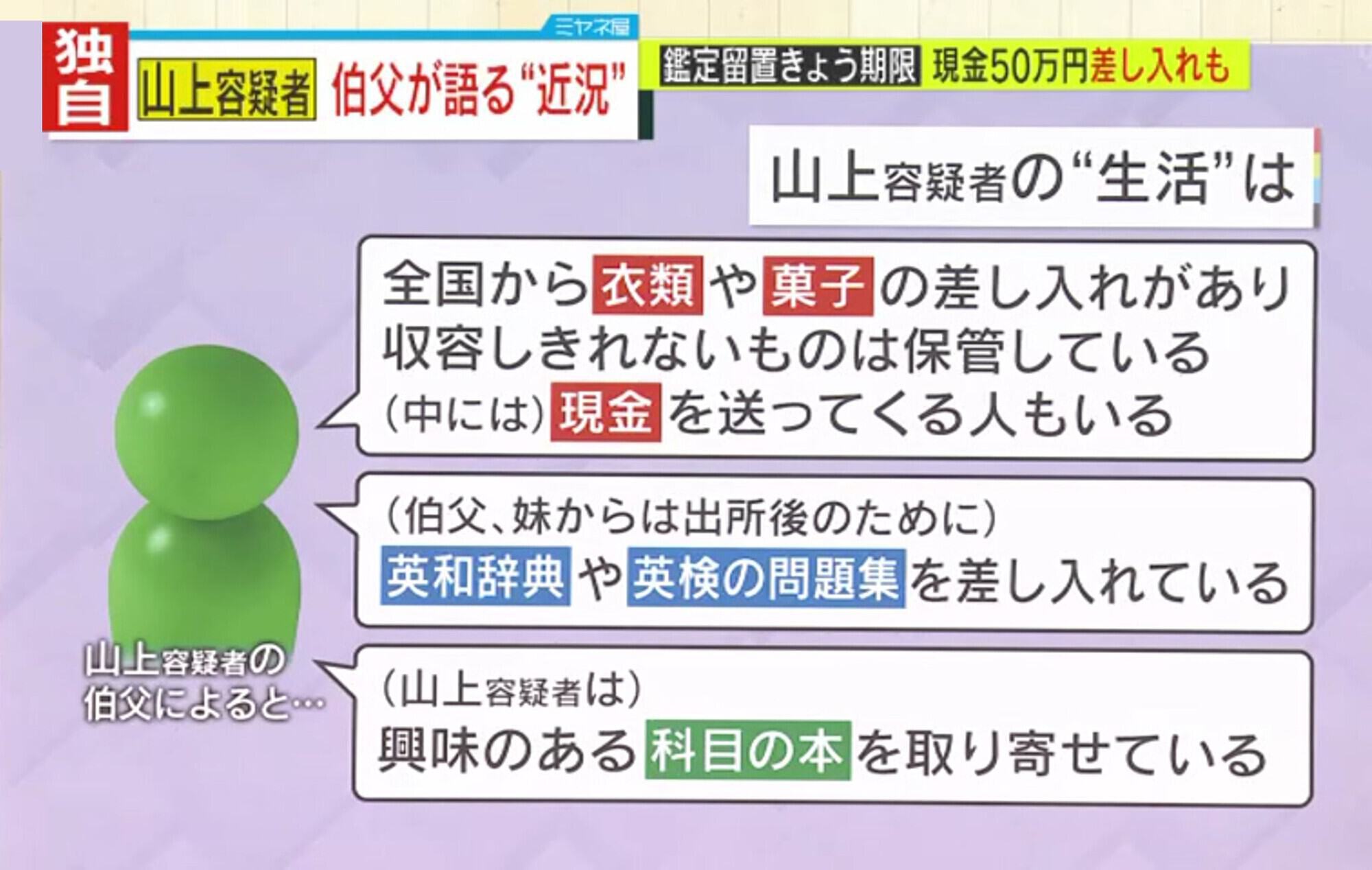 また、山上容疑者の拘置所での生活について伯父は「全国から衣服や菓子の差し入れがあり、収容しきれないものは保管している。(中には)現金を送って来る人もいる」と言い、伯父や妹は出所後のために「英和辞典や英検の問題集を差し入れしている」と語りました。さらに山上容疑者は、興味のある科目の本を取り寄せているということです。