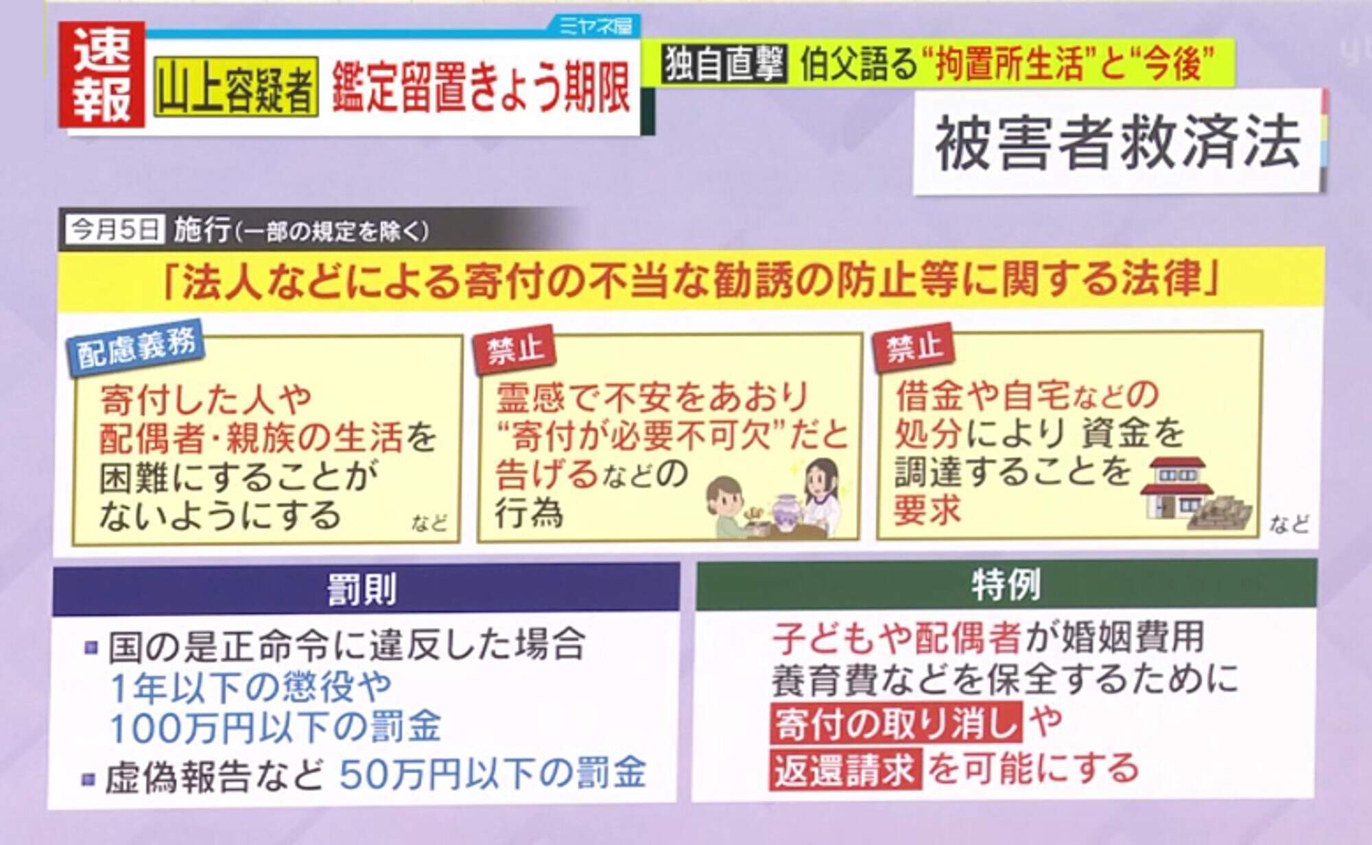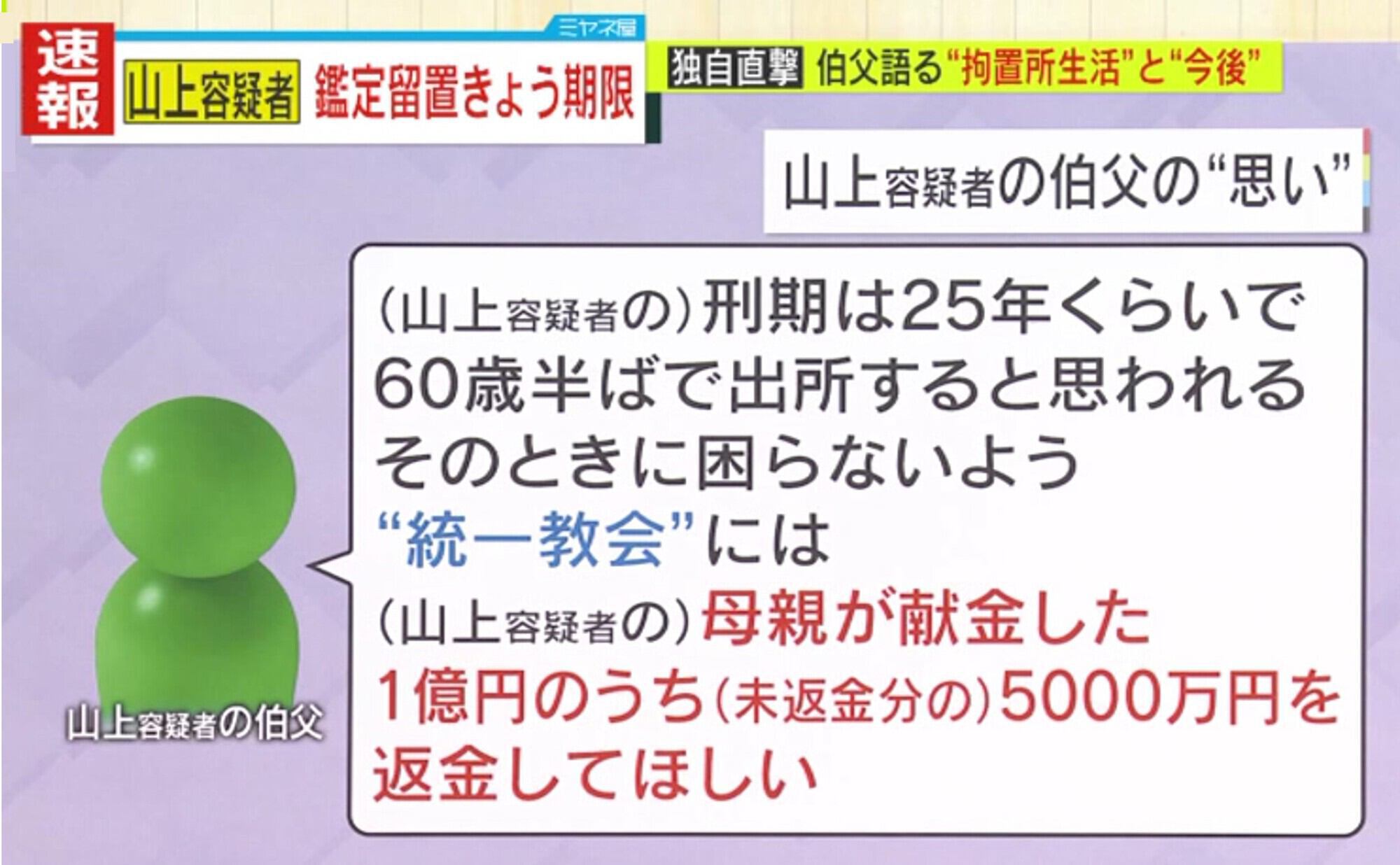 一方で、山上容疑者の伯父は「(山上容疑者の)刑期は25年くらいで、60歳半ばで出所すると思われる。その時に困らないよう、“統一教会”には(山上容疑者の)母親が献金した1億円のうち、(未返金分の)5000万円を返金してほしい」という思いを抱えています。