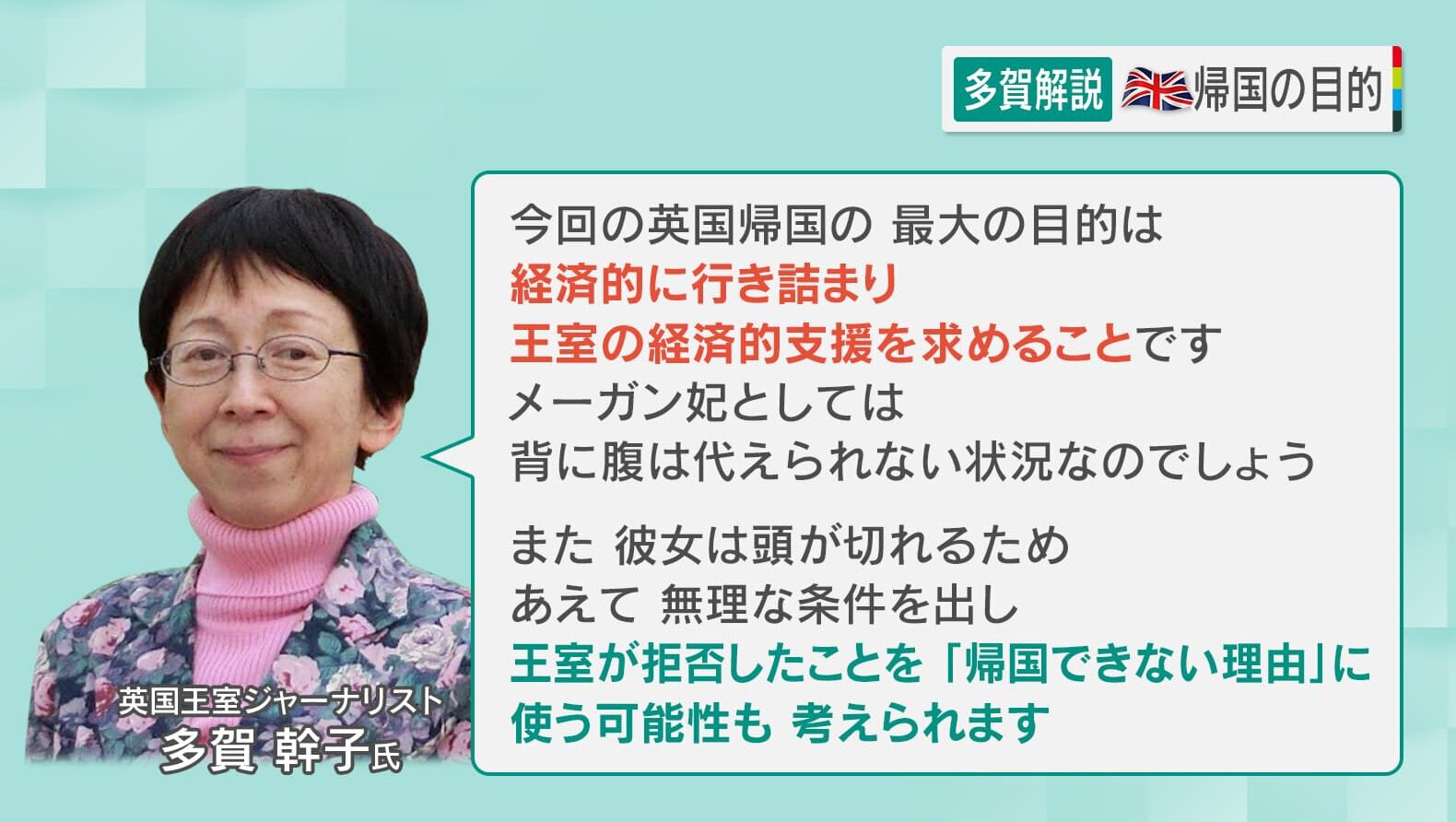 ヘンリー王子夫妻のイギリス帰国の目的に対し、英国王室ジャーナリストの多賀幹子氏は「今回の英国帰国の最大の目的は、経済的に行き詰まり、王室の経済的支援を求めることです。メーガン妃としては、背に腹は代えられない状況なのでしょう。また、彼女は頭が切れるため、あえて無理な条件を出し、王室が拒否したことを『帰国できない理由』に使う可能性も考えられます」と分析しています。