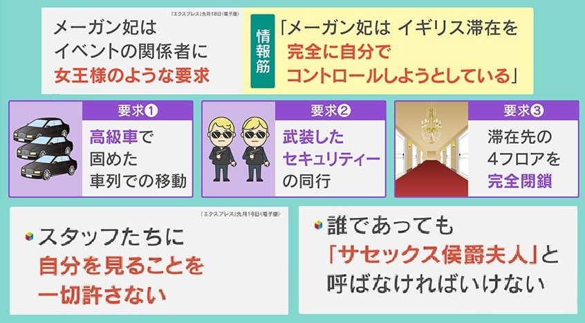 さらに、同月18日の『エクスプレス(電子版)』によると、「メーガン妃は、イベントの関係者に女王様のような要求をしている」と報じています。情報筋によると、「メーガン妃は、イギリス滞在を完全に自分でコントロールしようとしている」として、高級車で固めた車列での移動や、武装したセキュリティーの同行、そして滞在先の4フロアを完全に閉鎖することを要求しているといいます。さらに、スタッフたちに自分を見ることを一切許さず、誰であっても『サセックス侯爵夫人』と呼ばなければいけない、ということです。