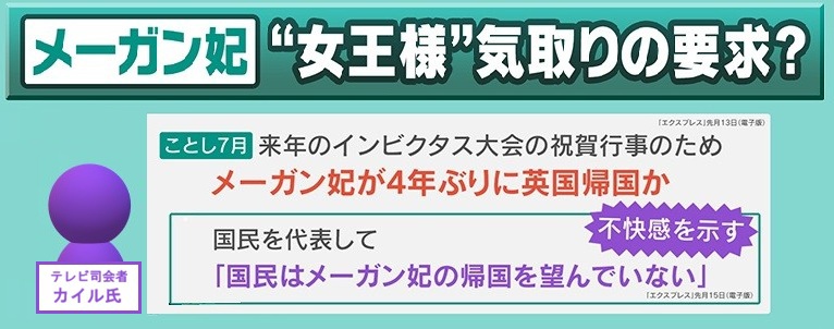 2026年1月13日『エクスプレス(電子版)』によると、2027年に行われる『インビクタス大会』の祝賀行事のため、2026年7月に、メーガン妃が4年ぶりにイギリスに帰るのではないかと報じられています。1月15日の『エクスプレス(電子版)』によると、テレビ司会者のカイル氏が、国民を代表して「国民はメーガン妃の帰国を望んでいない」と、不快感を示しているということです。