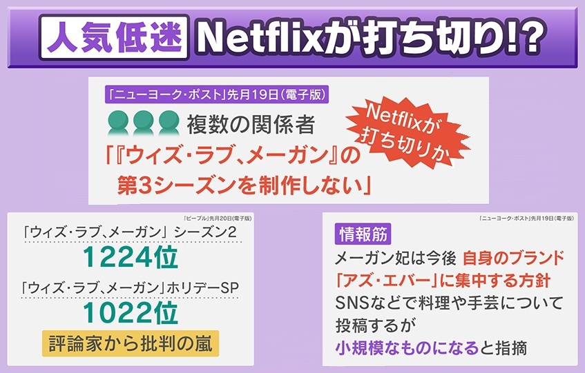 1月19日の『ニューヨーク・ポスト(電子版)』は、複数の関係者からの話で、「『ウィズ・ラブ、メーガン』の第3シーズンを製作しない」として、Netflixが打ち切りを検討していると報道しました。シーズン2は1224位、ホリデースペシャルも1022位と、評論家から批判の嵐となっています。情報筋によると、メーガン妃は今後、自身のブランド『アズ・エバー』に集中する方針で、SNSなどで料理や手芸について投稿するが、小規模なものになると指摘しています。
