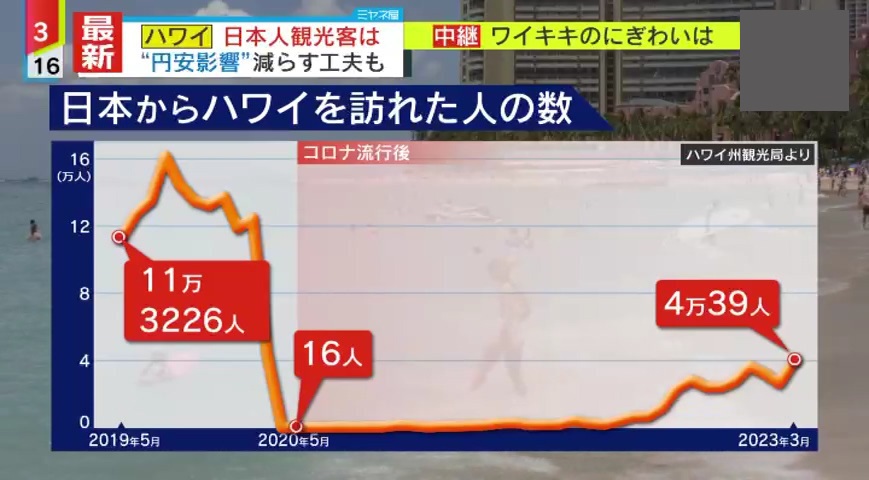 コロナ流行前の2019年5月、ハワイを訪れた日本人は約11万人でしたが、翌2020年5月には16人にまで激減しました。しかし最新の統計によると、今年3月には4万人を超え、ハワイ州の試算では、今年1年間で96万人の日本人観光客が訪れるとみられています。