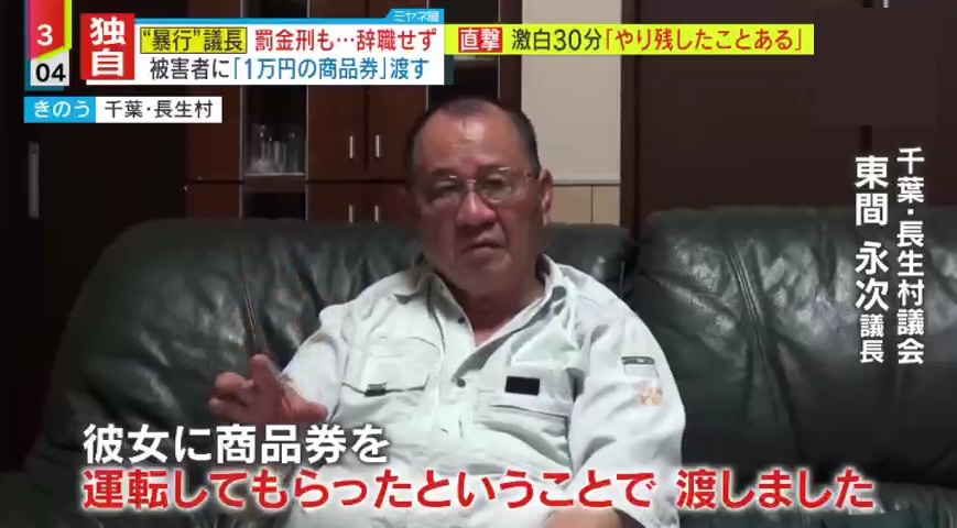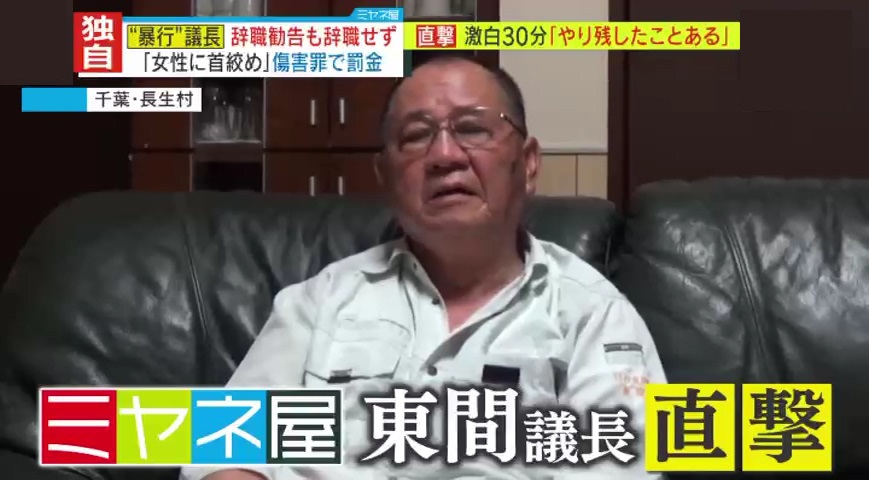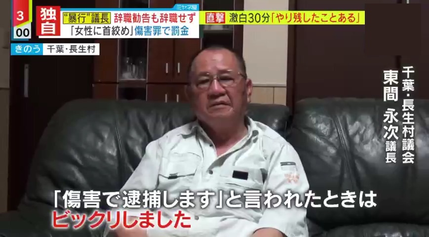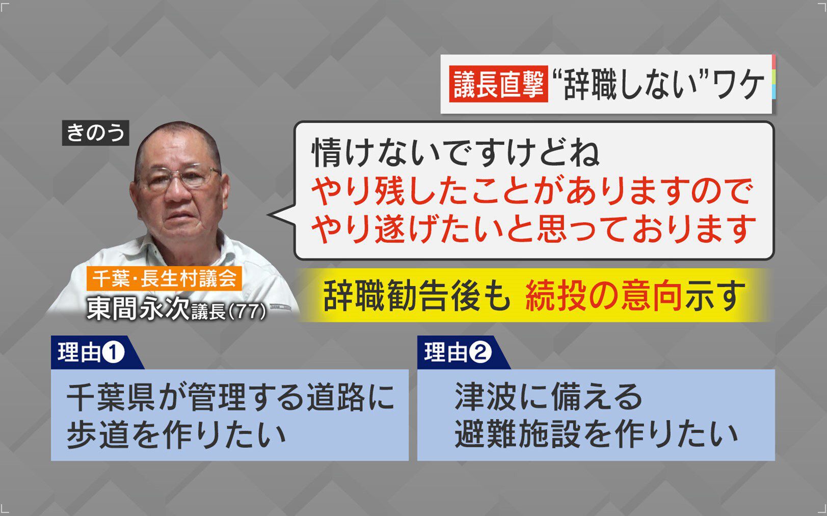 女性職員への暴行で逮捕・起訴され、その後のセクハラ・パワハラなどで2度の辞職勧告決議案が可決された千葉県長生村の東間永次村議会議長ですが、村民から失望の声が上がる中でも「辞職は考えていない」と言います。実際に女性職員との間に何があったのか?今の心境は?渦中の議長本人に直撃しました。