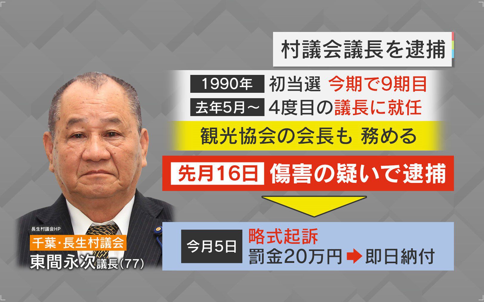 4月7日、千葉県長生村の東間議長・木嶋晴一副議長・男性職員・女性職員の6人で歓送迎会が行われました。その後、夜10時まで2次会が行われ、女性職員が運転する公用車で参加者を送ることになったということです。その公用車の中で、東間議長が運転していた女性職員に対して「左腕を何度も殴る・髪の毛を引っ張る・シートベルトで首を絞める」などの暴行を行い、女性職員は全治2週間程度のけがをしたということです。