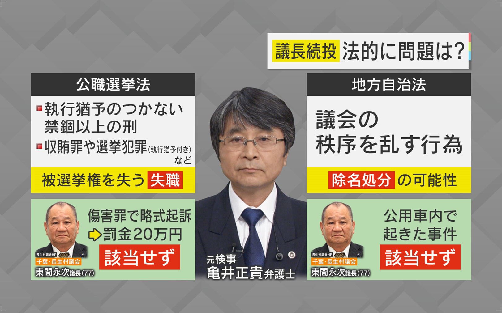 この議長を辞職させることはできないのでしょうか?亀井正貴弁護士によると「公職選挙法では、『執行猶予のつかない禁固以上の刑』または『収賄罪や選挙犯罪』などでは被選挙権を失って失職するが、今回は略式起訴で罰金20万円なので該当せず」とのことです。また、「地方自治法において『議会の秩序を乱す行為』があった場合は除名処分の可能性があるが、今回は公用車の中で起きた事件なので、該当しない」ということです。村民や同僚議員から批判がある中、本人の去就が注目されています。