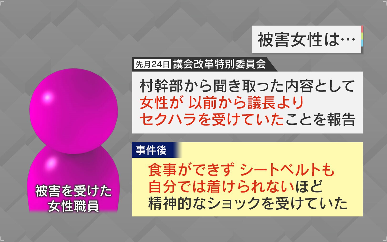 現在、東間議長は被害者の女性職員とは直接会わないようにしているといいます。議会改革特別委員会が村幹部から聞き取った内容として、被害を受けた女性が、以前より議長からセクハラを受けていたことを報告しています。女性は事件後、食事ができず、シートベルトも自分では付けられないほど、精神的なショックを受けていたということです。