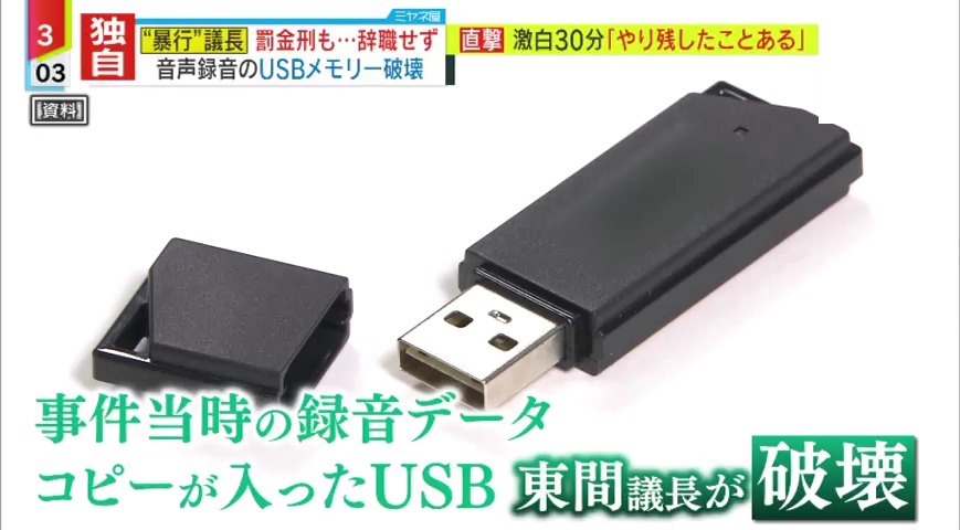 そして新たに、事件当時の車内の様子を録音した音声データ2つのうち、「コピーが入ったUSBメモリー」を東間議長が破壊していたことが明らかになりました。