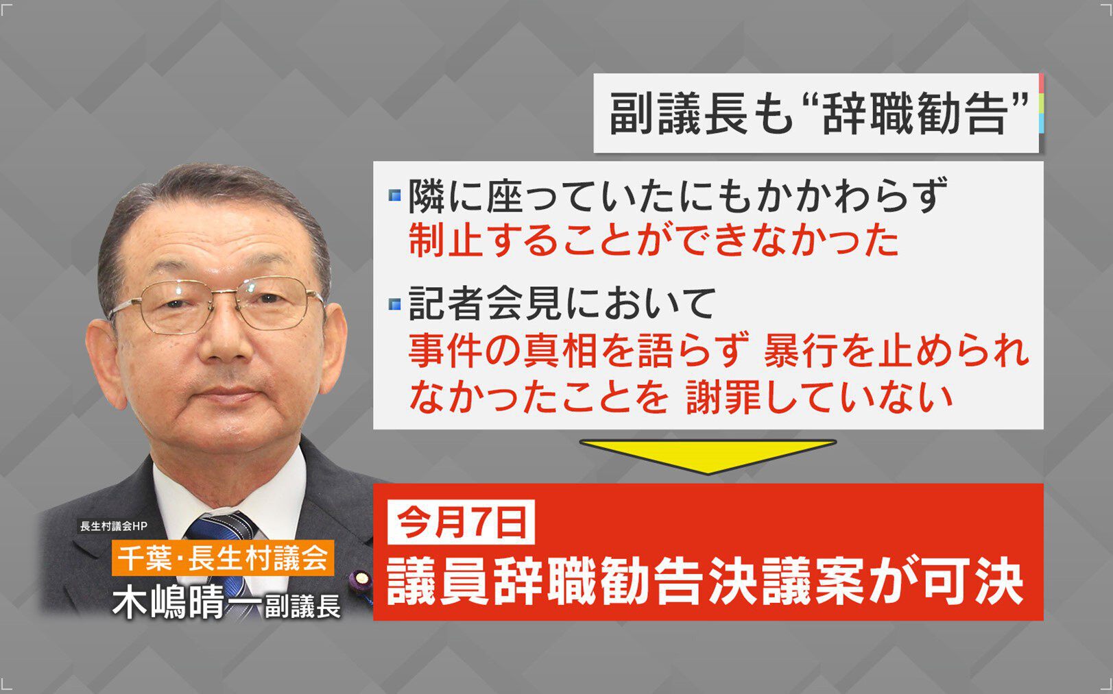 また議長だけでなく木嶋晴一副議長にも「隣に座っていたにもかかわらず、制止することができなかった」「記者会見において事件の真相を語らず、暴行を止められなかったことを謝罪していない」として“辞職勧告”が出ています。