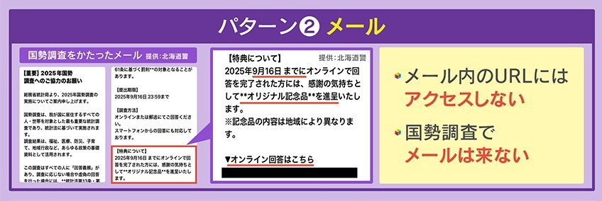 北海道警が国勢調査をかたったメールを公開しました。そのメールには『【特典について】2025年9月16日までにオンラインで回答を完了された方には、感謝の気持ちとしてオリジナル記念品を進呈いたします』と書かれていました。