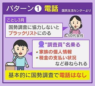 国民生活センターによると、2025年3月、自動音声で「国勢調査に協力しないとブラックリストに載る」という電話があったといいます。また、“調査員”を名乗る人物から、家族の個人情報・税金の支払い状況などを尋ねられた事例もあったということです。