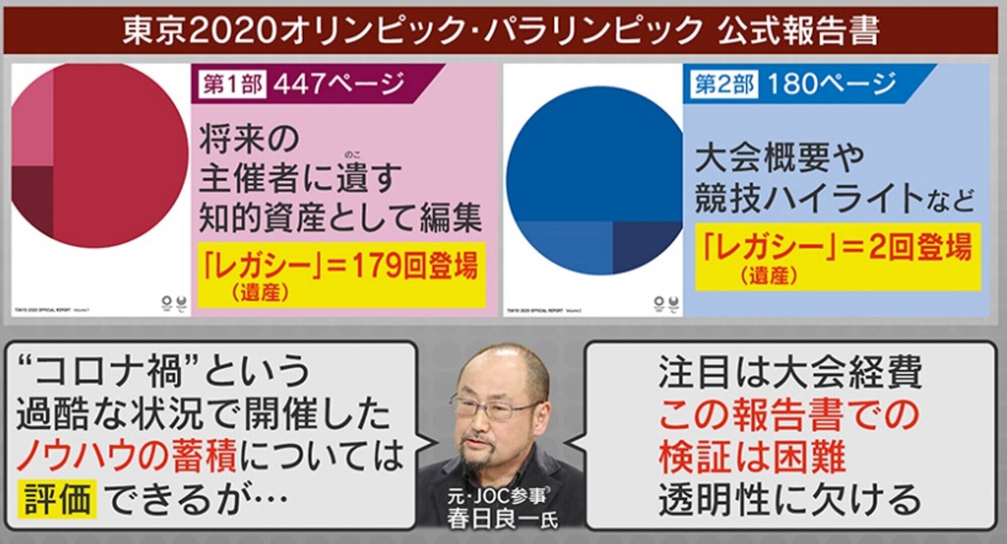 さらに、公開された東京2020オリンピック・パラリンピック公式報告書の中で橋本会長は、「東京2020大会のレガシーの一つは人だと思う。この先の豊かな人生の実現とスポーツを通した社会貢献に一層の理解と協力願っている」と記しています。報告書の中でも、第1部で179回、第2部は2回“レガシー”という言葉が登場しています。