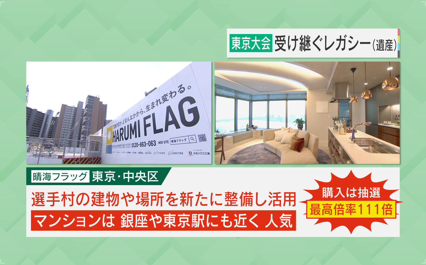 一方、東京・中央区にある選手村の建物や場所を新たに整備した「晴美フラッグ」ですが、「晴美フラッグ」の中にあるマンションは銀座や東京駅にも近く人気があり、購入は抽選で、その倍率は最高111倍となっています。