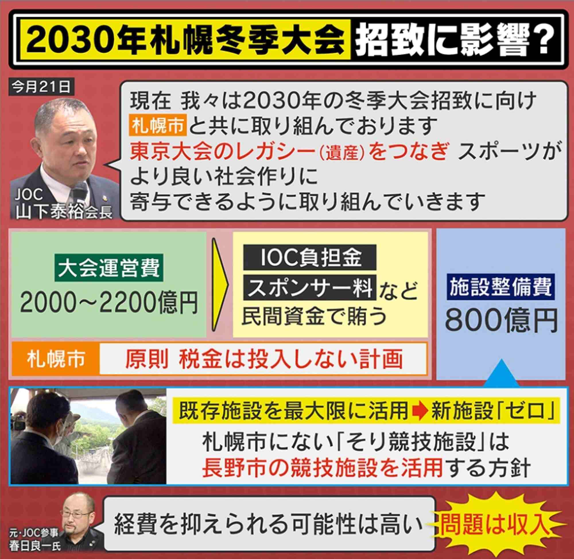 JOCの山下泰裕会長は6月21日、「現在、我々は2030年の冬季大会招致に向け、札幌市とともに取り組んでいる。東京大会のレガシーをつなぎ、スポーツがより良い社会作りに寄与できるように取り組んでいく」と話しました。札幌大会の運営費は2000~2200億円を見込んでいて、IOCの負担やスポンサー料などの民間資金で賄い、原則税金は投入しない計画だということです。また施設整備費について、既存施設を最大限に活用し、新たな施設はつくらず、例えば札幌市にない「そり競技施設」は長野市のものを活用して、全体で800億円に収めるとしています。