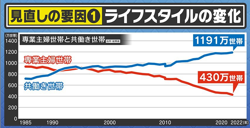 見直しの要因の一つが、ライフスタイルの変化だと言います。社会の実態とあっていないという声もありましたが、現状専業主婦世帯は減っていて共働き世帯が増えています。