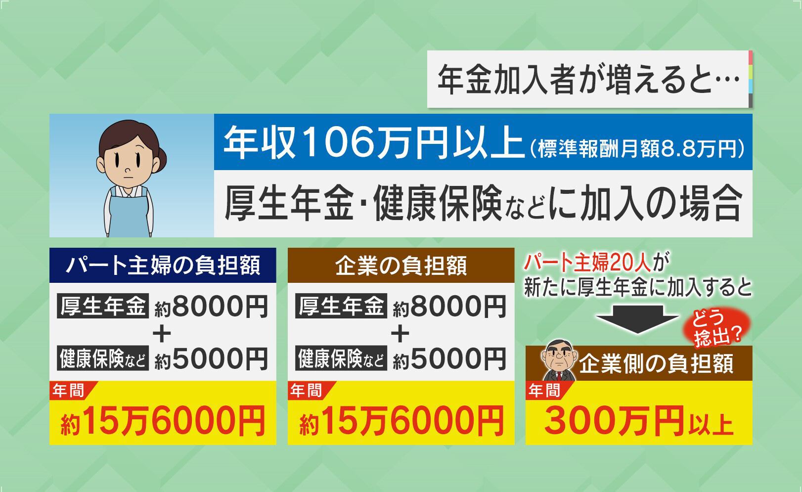 年収106万円を超えた場合、厚生年金や健康保険などに加入することになりますが、厚生年金などは、本人と企業が折半で払っていますので、本人だけでなく、雇用する企業も負担することとなり、年収106万円だと年間約15万6000円がそれぞれ負担増となります。パートの主婦20人が新たに厚生年金などに加入すると、企業側の負担額は年間300万円以上となります。