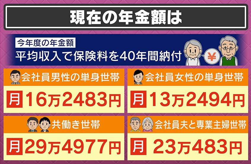 現在の年金額は、平均収入で保険料を40年間納付した場合、今年度の年金受給額は、会社員男性の単身世帯で月額16万2483円、会社員女性の単身世帯では、13万2494円となっています。夫婦で共働き世帯の場合、29万4977円です。そして会社員夫と専業主婦ですと、23万483円となります。これは納付金額と、納付期間で変わってきます。
