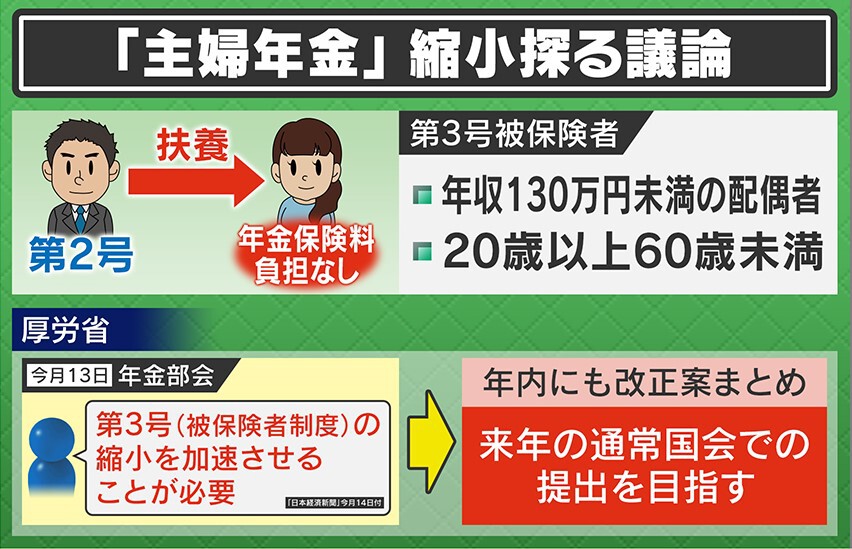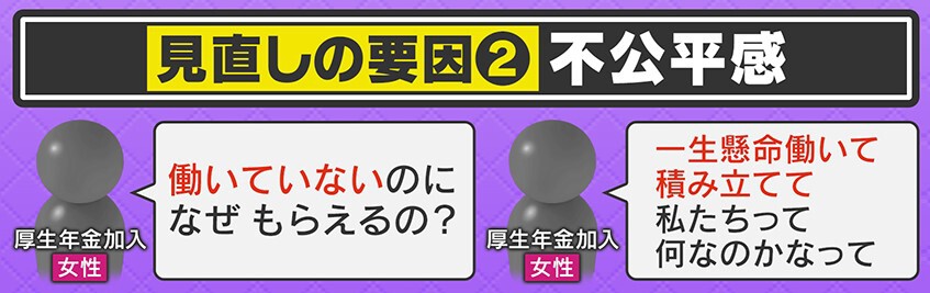ほかに見直しの要因としては、不公平感があります。厚生年金に加入している女性からは「働いていないのになぜもらえるの?」や「一生懸命働いて積み立てて、私たちって何なのかなって」という声も出ています。