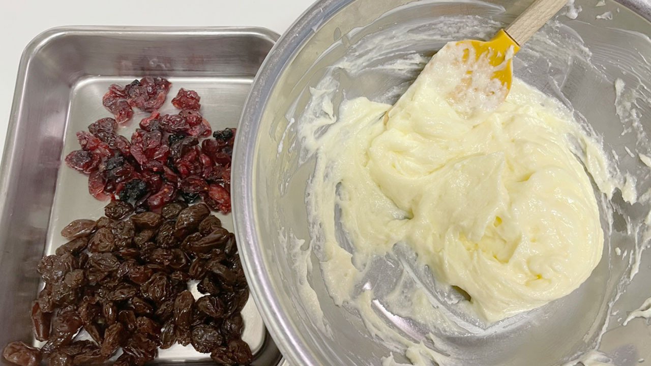④ ラム酒につけたレーズンを軽くキッチンペーパーで水分を取り、③のバタークリームに入れ混ぜる