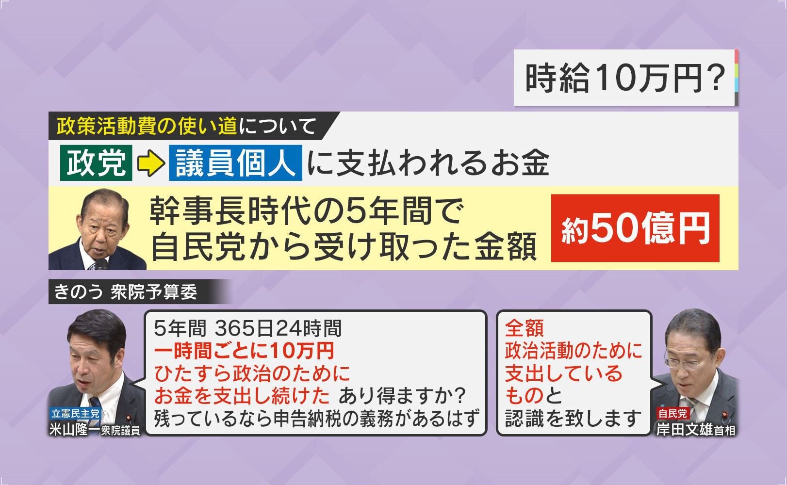 政党から議員個人に支払われる政策活動費は、議員個人側の報告書への記載の義務はないということですが、二階元幹事長は幹事長時代の5年間で自民党から受け取った金額が約50億円になるということで、時給に換算すると1時間10万円だという指摘もされています。これに、岸田総理は「全額政治活動のために支出しているものと認識を致します」とコメントしています。
