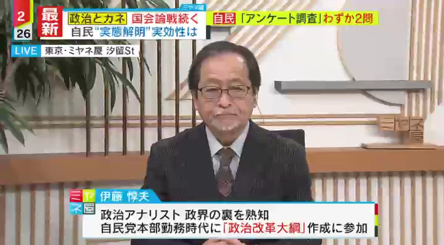 自民党の“裏金”問題で党が議員へ行う「アンケート」がわずか2問だけだとして、「アンケート」はアリバイ作りだ!と国会で集中砲火を浴びています。また二階元幹事長が受け取った政策活動費が50億円にのぼることも問題視されています。政治とカネの問題は前進しているのでしょうか?元自民党本部職員で政治アナリストの伊藤惇夫氏が解説します。