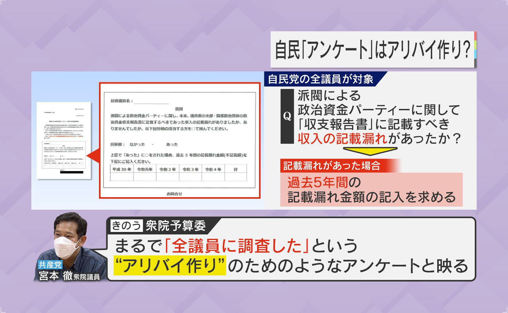 「そもそも全議員アンケートですが、派閥のパーティーに限定していますので無派閥の人は関係ないんです。全議員ではないということになります。言ってみれば『やったよ』という“アリバイ工作”です。問題なのは、『いつ受け取ったのか?』例えば選挙の後と構えだとか。それと、『受け取った金銭を何に使ったのか?どう保管したのか?』という質問がないとこのアンケートに意味はありません」