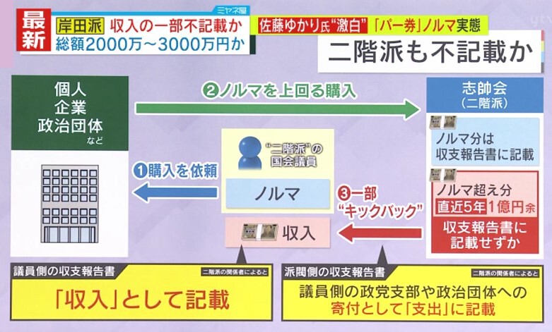 また、二階派でも不記載かといわれています。安倍派と同じ構図でノルマを上回った分について記載していなかったとみられ、その一部をキックバックしていたとみられていますが、二階派の関係者によると、キックバックの分は「派閥側の報告書で、寄付として『支出』に記載していた」、また「議員側としても『収入』として記載していた」ということです。