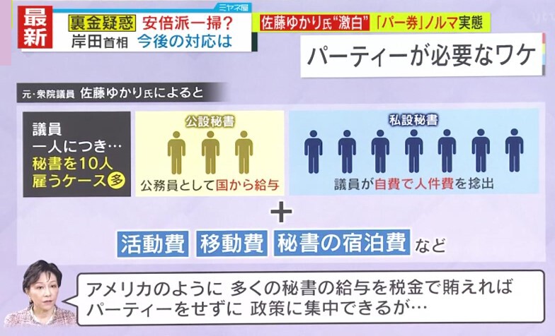 「私の秘書が相当苦労して、それこそ靴底をすり減らして売り歩くということをやっていました。さきほど個人のパーティーが年に2回とありましたが、コロナ禍以前は年に4回やらないと回らないぐらい支出が多かったです。問題は、公職選挙法の“穴”です。公職選挙法は『お金をかけない選挙をしましょう』という理念の下できたものですが、実際は、お金持ちの議員がいれば、いくらでも人件費を出せて秘書を雇えるわけで、青天井です。例えば、秘書の総人件費に上限をかけるなどして公正な競争ができる環境、そのことによって収入の心配も減らしていくことが大切だと思います」