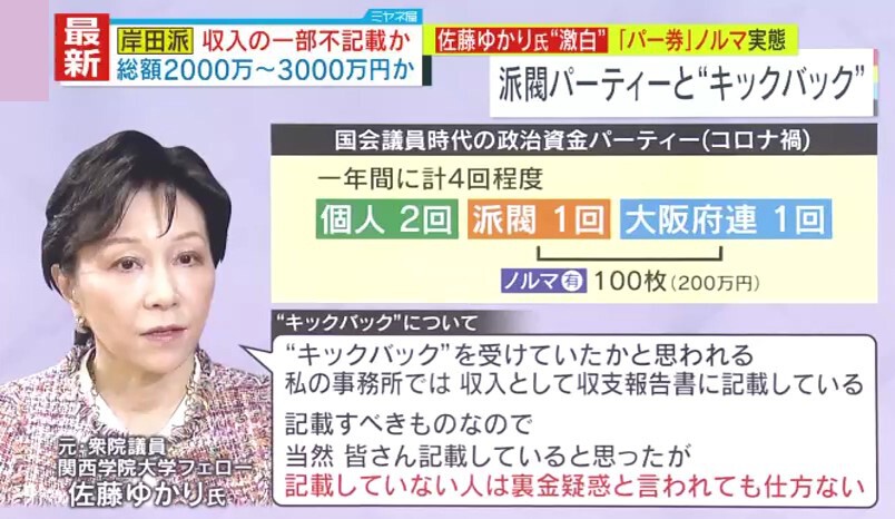 佐藤氏が国会議員時代、「政治資金パーティー(コロナ禍)」は一年間に個人2回・派閥1回・大阪府連1回の計4回程度あり、100枚200万円のノルマがあったといいます。キックバックについて佐藤氏は、「キックバックを受けていたかと思われる。私の事務所では、収入として収支報告書に記載している。記載すべきものなので、当然皆さん記載していると思ったが、記載していない人は裏金疑惑と言われても仕方がない」としています。