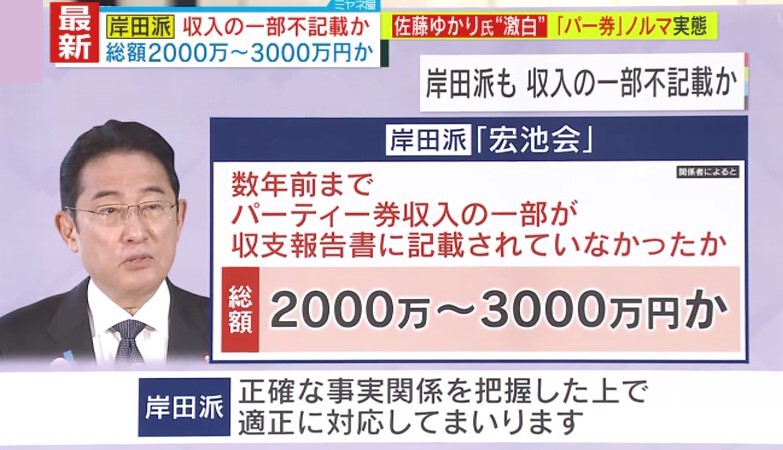 岸田派は、数年前までパーティー券収入の一部(総額2000万~3000万円)が、収支報告書に記載されていなかったとみられています。岸田派は「正確な事実関係を把握した上で、適正に対応してまいります」とし、取材に応じた岸田首相も「適切に対応する」と繰り返しました。