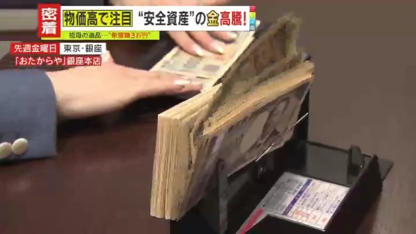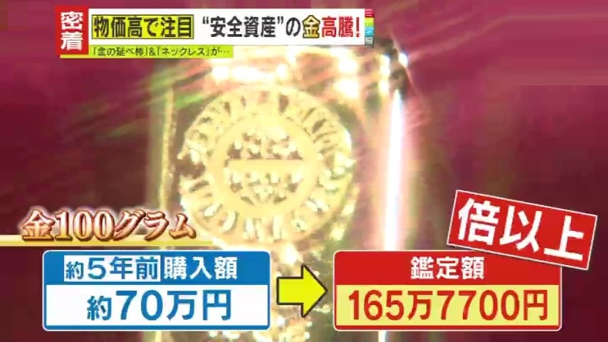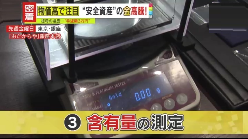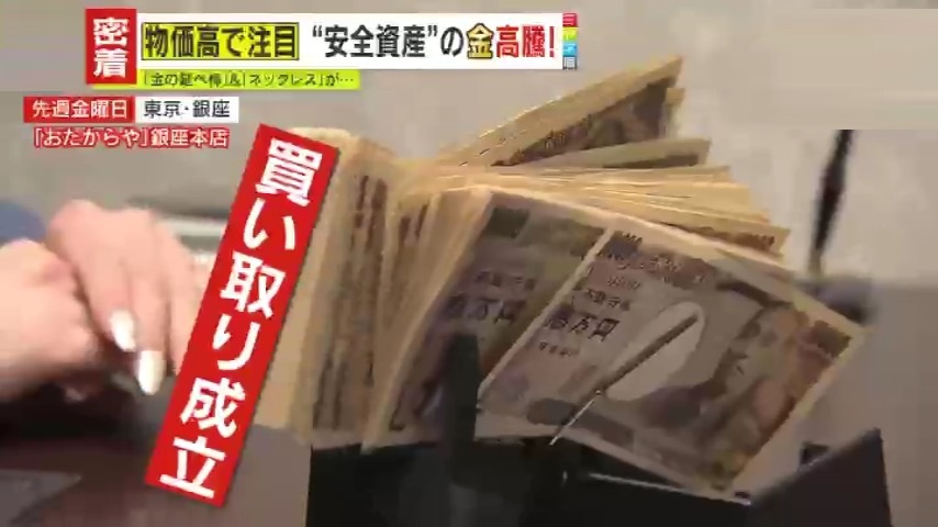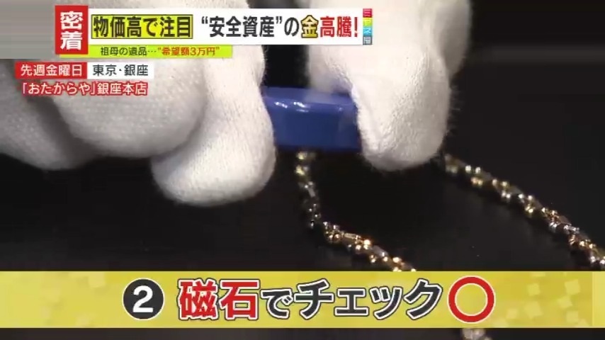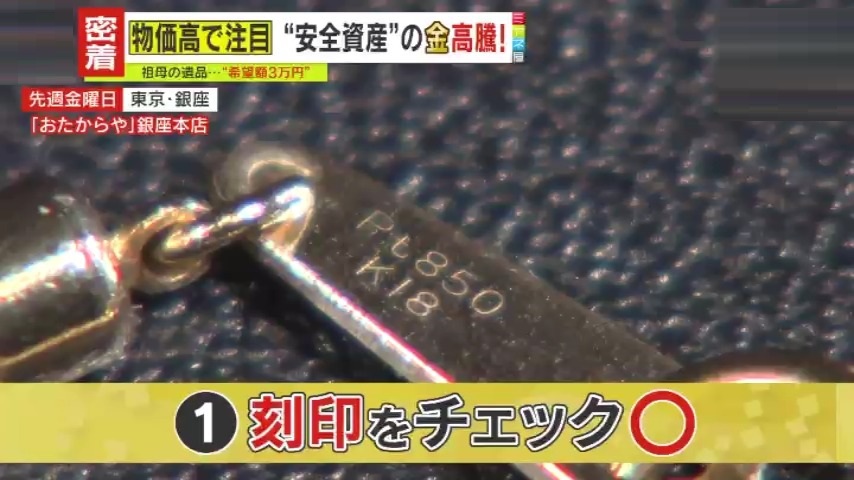 今、高騰が止まらない『金』。2005年1月に1グラム1477円だった金は、2025年4月22日には過去最高となる1万7160円と、10倍以上の価格に。そんな中、番組が訪れたのは、東京・銀座。買い取り専門店『おたからや』銀座本店で、金の買い取り現場に密着しました。