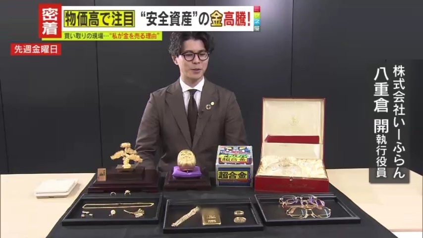 純金で出来た松の置物(130万円)に、純金のだるまの置物(360万円)、1キロの金の延べ棒(1657万7000円)など、金製品が並ぶ中…。