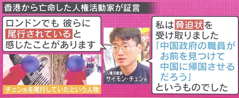 そして、香港から亡命した人権活動家のサイモン・チェン氏も中国政府からマークされ、尾行されたとされる写真を撮っています。また、脅迫状を受け取ったこともあり、「中国政府の職員がおまえを見つけて、中国に帰国させるだろう」という内容でした。