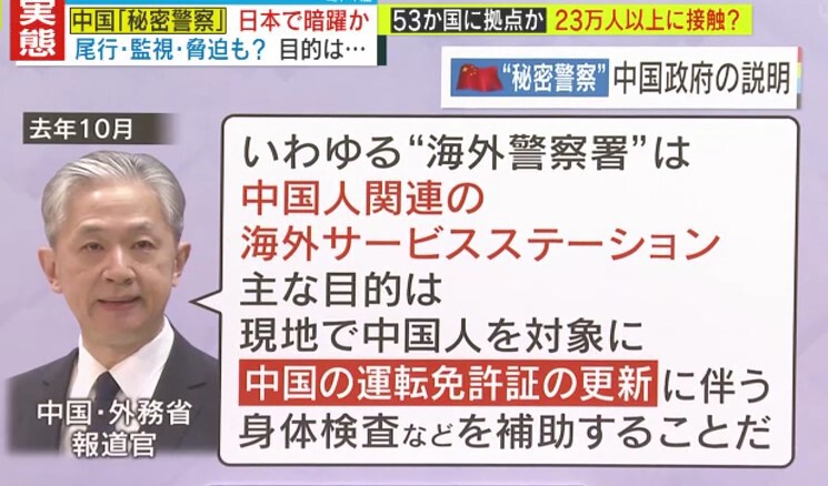 中国外務省は「事実根拠が皆無」として秘密警察の存在を否定しており、いわゆる“海外警察署”は運転免許証更新に伴う身体検査などの補助をする「中国人関連の海外サービスステーション」だと説明しました。