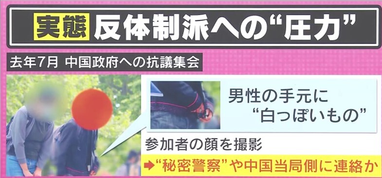実際に、反体制派への圧力を捉えた写真があります。2022年7月、中国政府への抗議集会に来ていた男性が参加者の顔をカメラで撮影しているものとみられ、秘密警察や中国当局側に連絡していたのではないかといわれています。