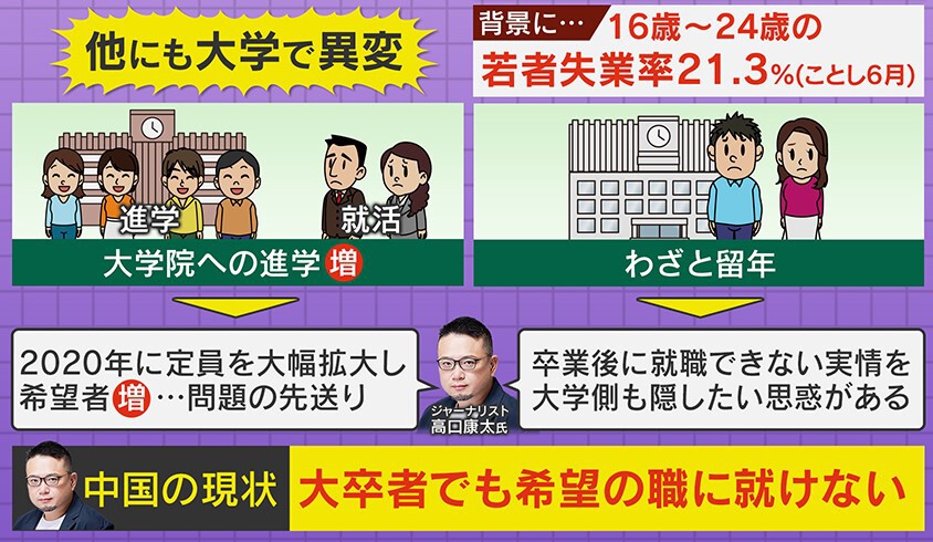 中国では、大学院への進学が増えています。また、わざと留年する学生も増えています。その背景には6月で21.3%、5人に1人以上にも上る16歳~24歳の若者の失業率があります。高口氏は、「2020年に大学院の定員を大幅に増やしたが、これは問題の先送りに過ぎない」「卒業後に就職できない実情を大学側も隠したい思惑がある」ということで、今の中国では「大卒者でも職に就けない」実情があるといいます。