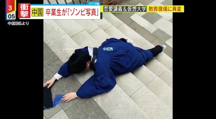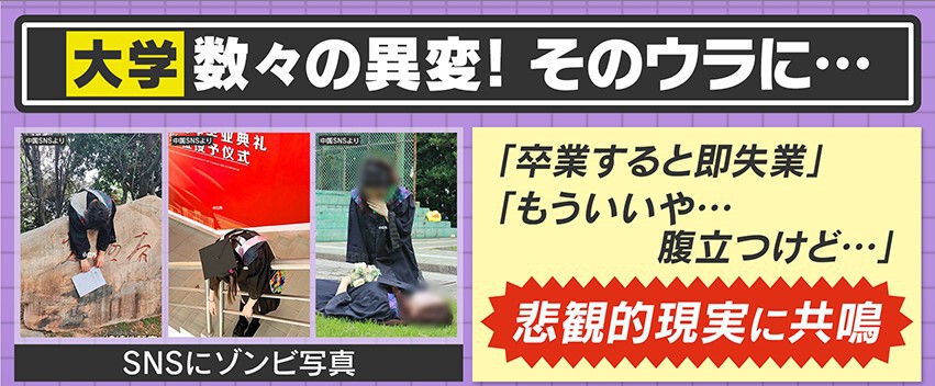 今中国では、大学の卒業式の後にゾンビのような写真をSNSに投稿するのが流行っているといいます。その理由は「卒業すると即失業」などの悲観的現実に、若者同士が共鳴しているからだということです。